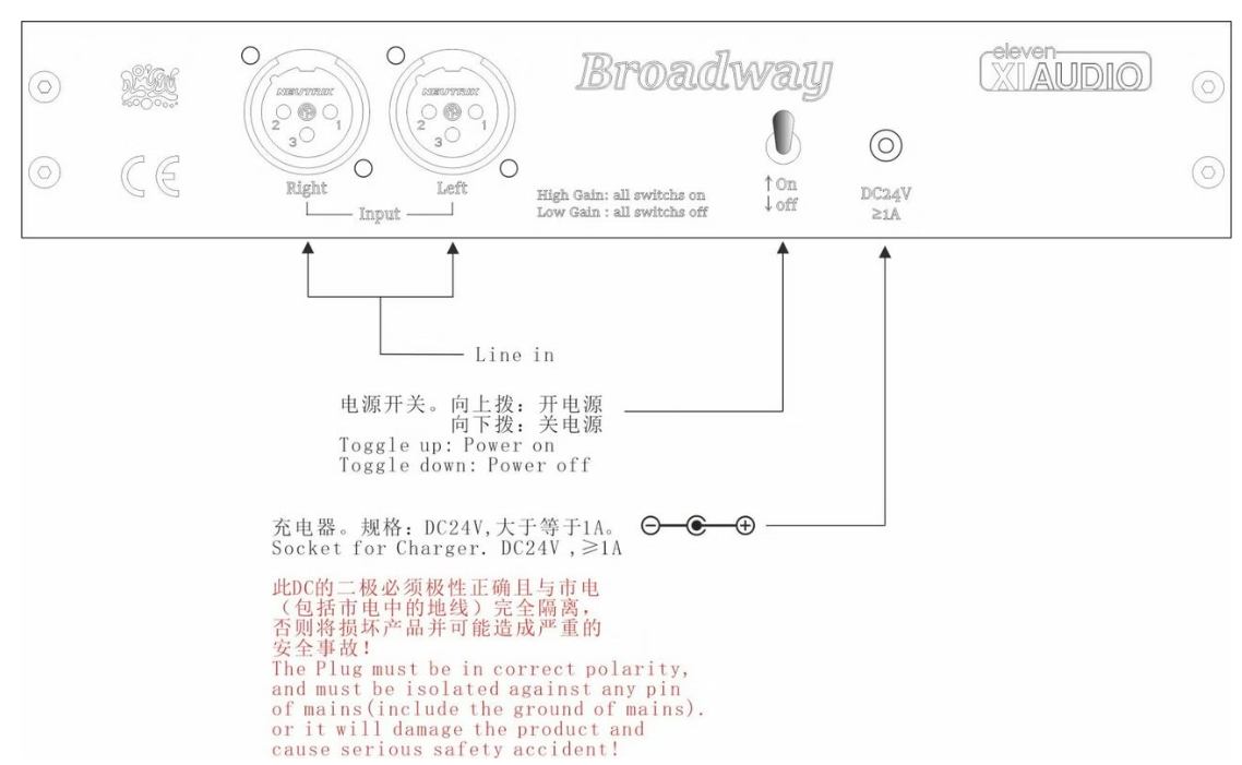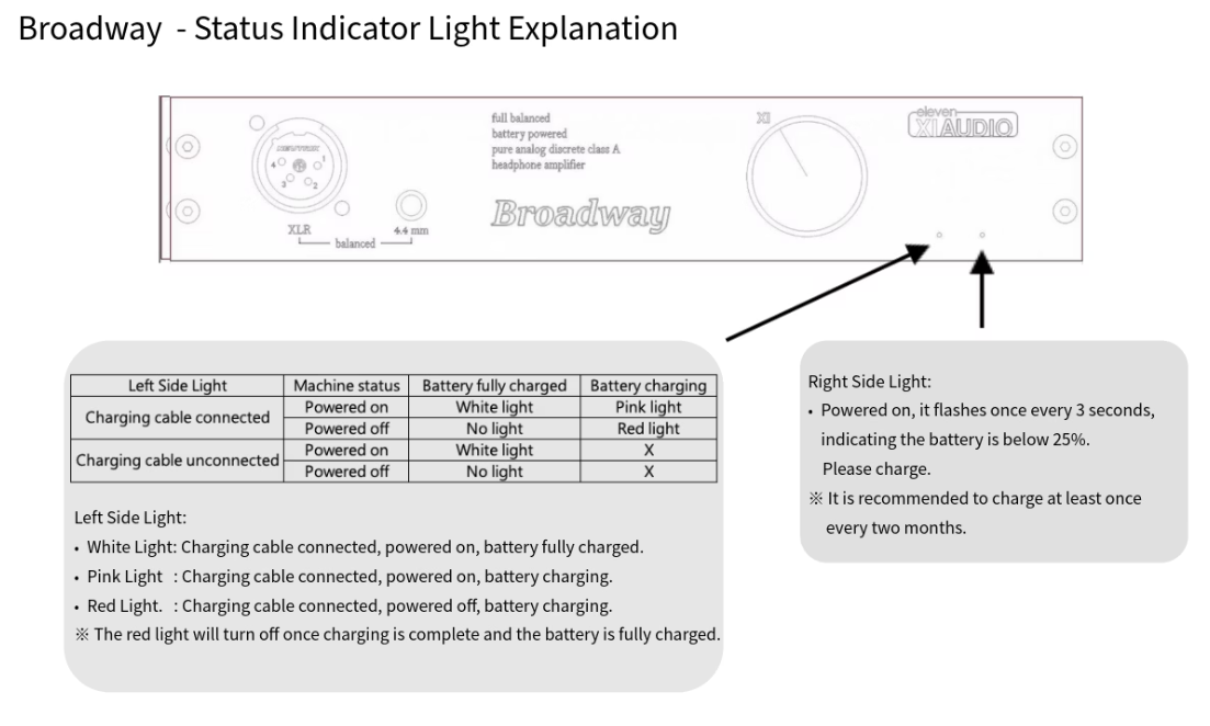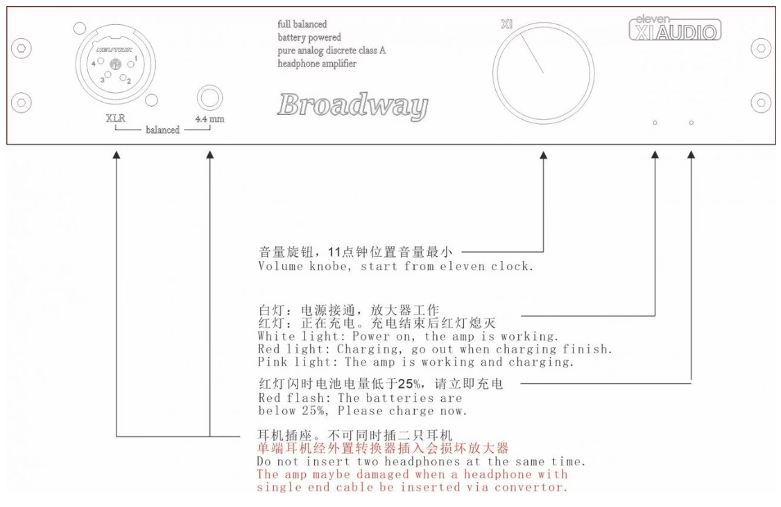 Accepts only balanced XLR L/R channel inputs. Four channels of amplification straight through to a high performance balanced headphone connection with 1.5 full watts of super smooth sounding class A bias amplification. DC coupled means huge low frequency bass resolution, the Broadway sounds way larger than it looks and can drive more power hungry headphones with ease. (For very demanding headphones see Eleven Audio Formula S Amplifier)